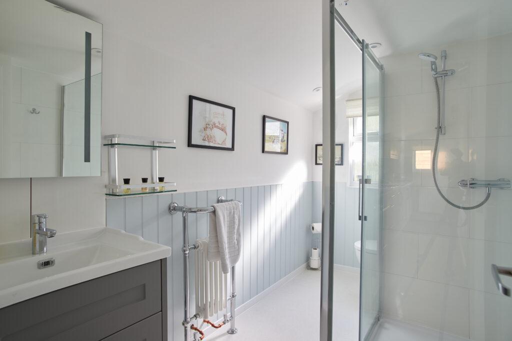Drift off in comfort in the beautifully furnished king size bedroom, complete with a luxurious four-poster bed. Thoughtfully decorated with calming tones and soft lighting, it offers a peaceful retreat after a day of exploring the Norfolk coast. French doors open directly onto the garden and hot tub area, bringing the outside in and adding a touch of indulgence to your stay.